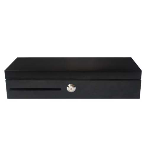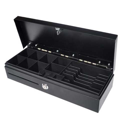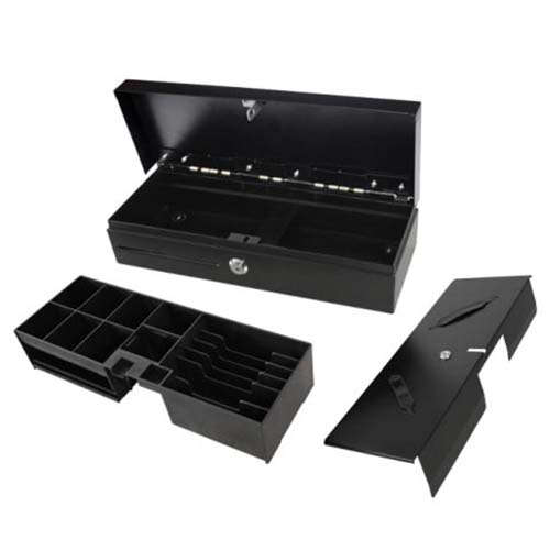 Flip Top predal za denar, črn/črn, 24V, RJ11, mikro stikalo, s kaseto, 6 ležišč za bankovce, 8 čašic za kovance, 460 x 170 x 100 mm.